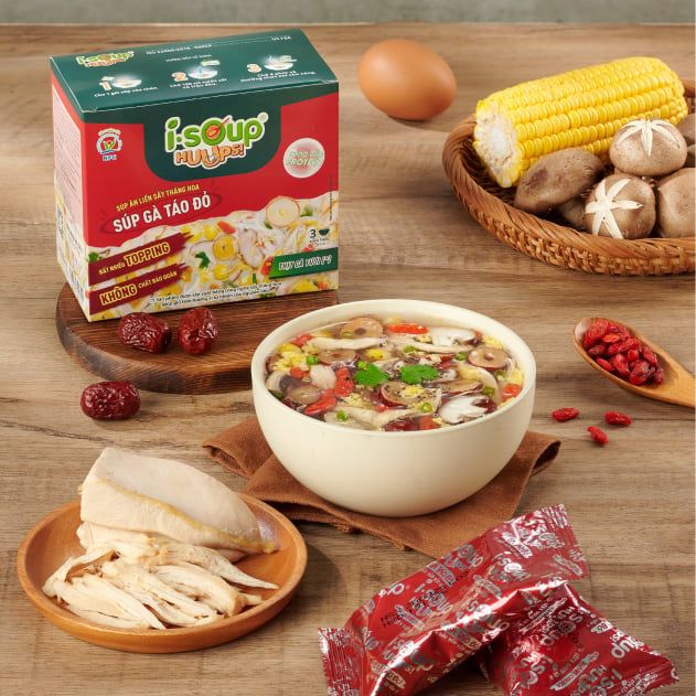 Súp Gà Táo Đỏ HUUPS! là sự kết hợp tinh tế giữa thịt gà xé thật, táo đỏ, kỷ tử, nấm đông cô và trứng, tạo nên vị thanh ngọt, nhẹ nhàng mà vẫn đầy dinh dưỡng.