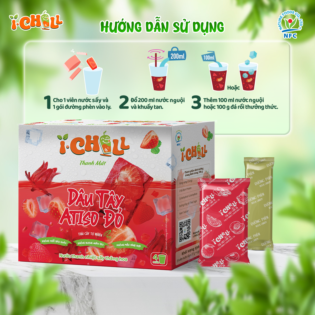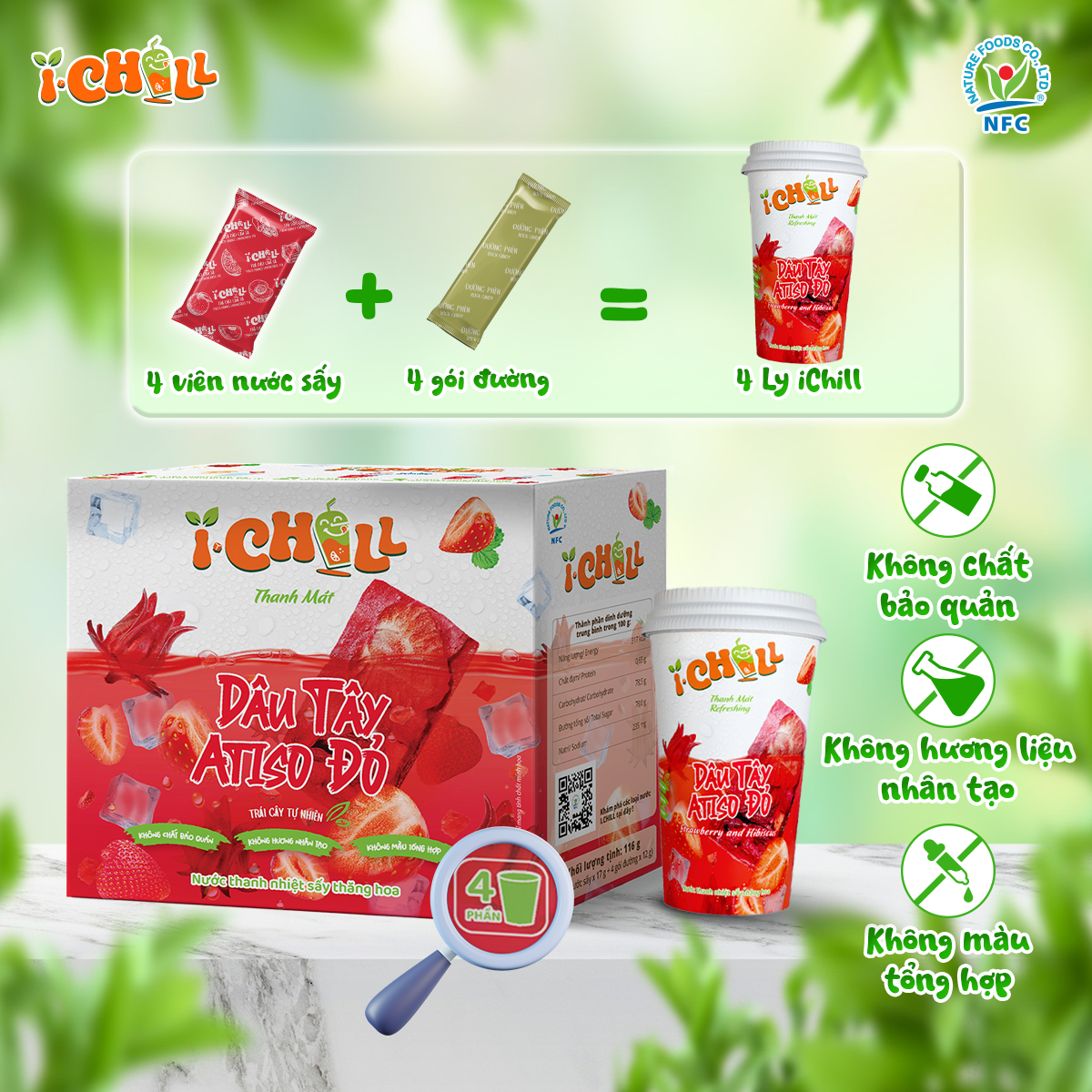 iChill Dâu Tây Atiso Đỏ Nước Thanh Nhiệt Sấy Thăng Hoa Từ Trái Cây Tự Nhiên 4 Gói X Hộp, Không Chất Bảo Quản, ISO 22000, HACCP, BRC