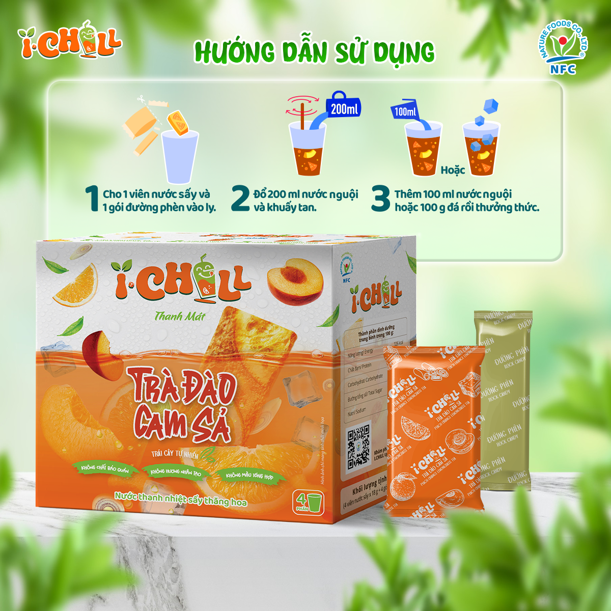 iChill Trà Đào Cam Sả Nước Thanh Nhiệt Sấy Thăng Hoa Từ Trái Cây Tự Nhiên 4 Gói X Hộp, Không Chất Bảo Quản, ISO 22000, HACCP, BRC