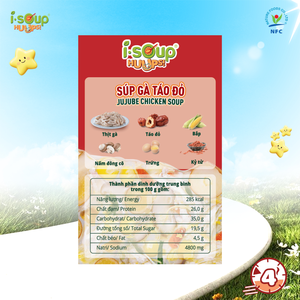 Súp Gà Táo Đỏ HUUPS! là sự kết hợp tinh tế giữa thịt gà xé thật, táo đỏ, kỷ tử, nấm đông cô và trứng, tạo nên vị thanh ngọt, nhẹ nhàng mà vẫn đầy dinh dưỡng.