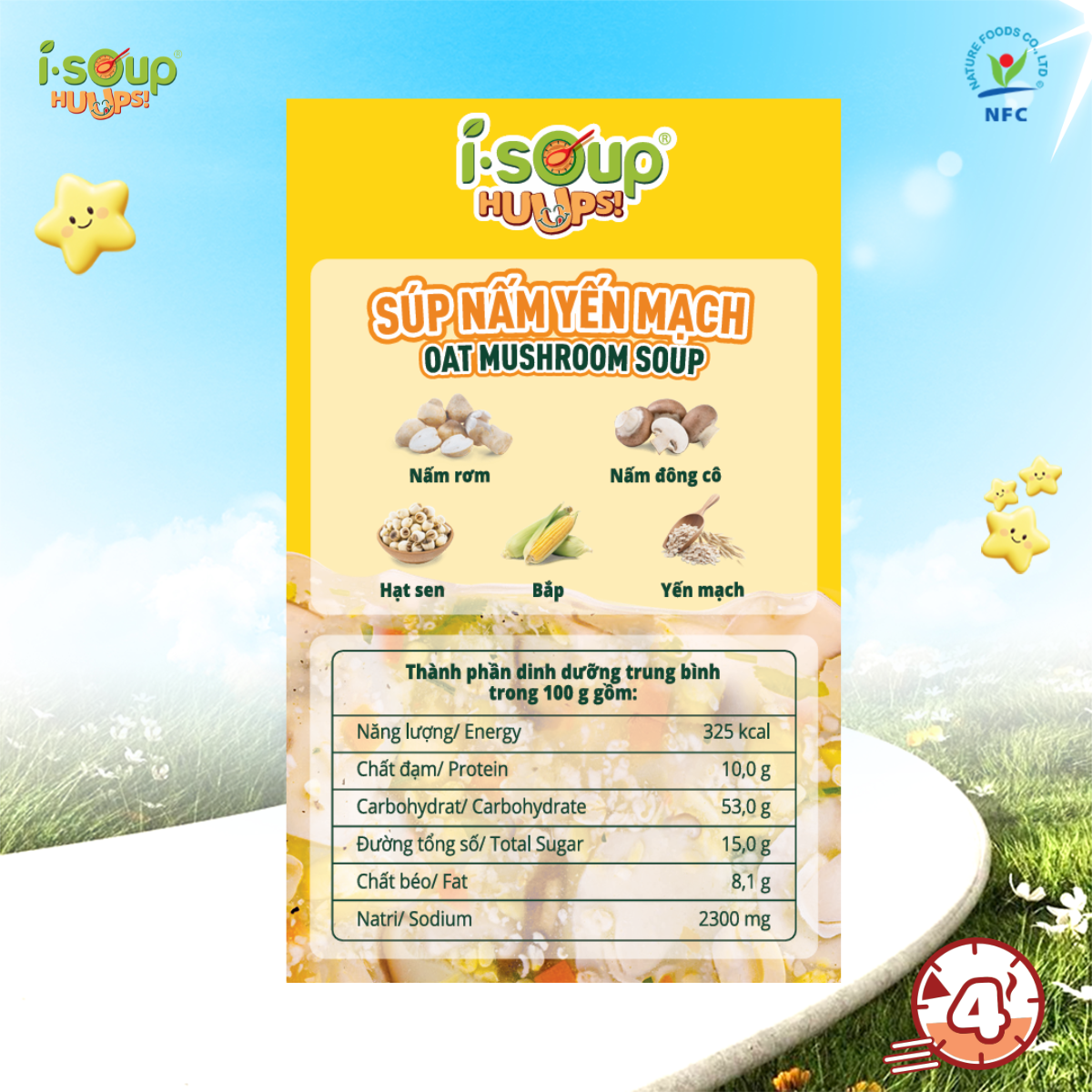 Chỉ cần thêm 150ml nước nóng, chờ 4 phút, khuấy nhẹ là có ngay chén súp nóng hổi, thơm ngon và đầy đủ năng lượng.